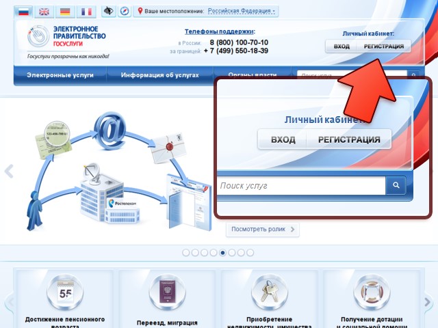 Регистрация на ЕПГУ начинается на главной странице https://www.gosuslugi.ru/ заполнением анкеты, а завершается получением кода активации и его вводом для завершения регистрации.